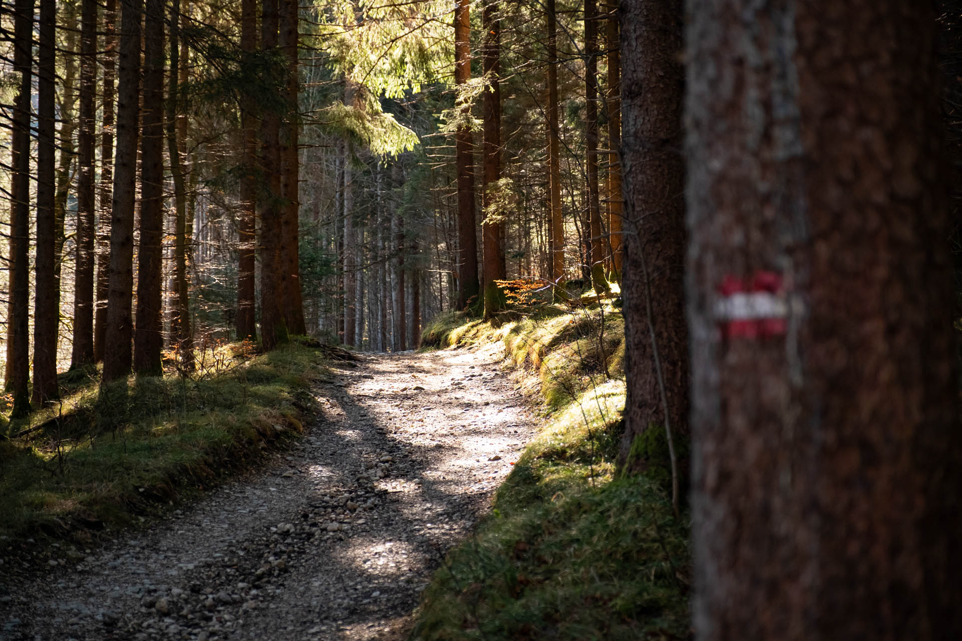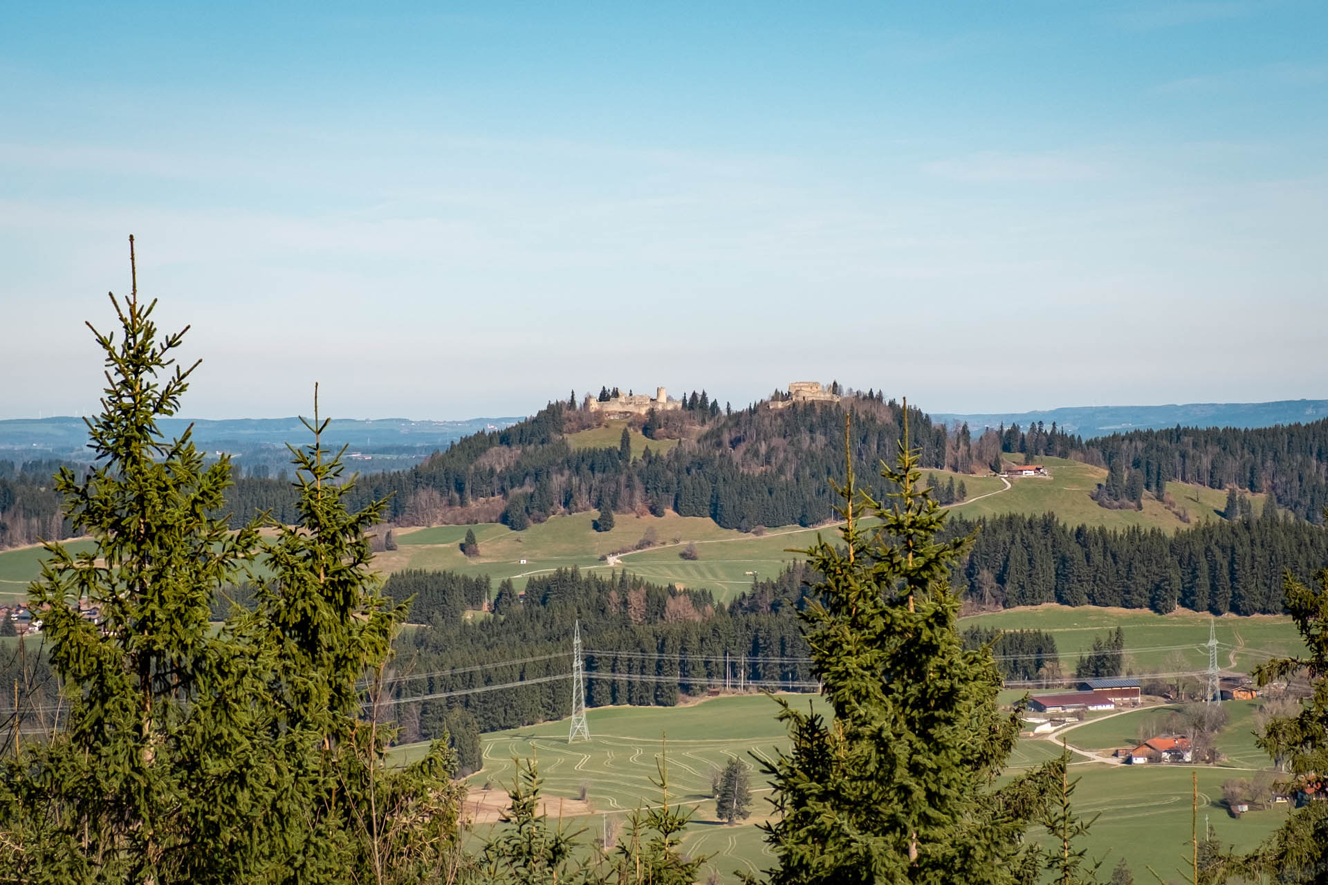 Zuerst wandern wir noch über den breiten Fahrweg durch Weideflächen bevor wir schon bald von Bäumen umgeben sind. Auf einem breiten Schotterweg geht es nun meist moderat, teils etwas steiler bergauf. Gut zu wissen: Auch hier halten wir uns in Richtung Burgruine Falkenstein. Über den sog. Beckner Berg geht es weiter bergan und schon bald erreichen wir die asphaltierte Mautstraße zur Blauen Burg. Nach ein paar weiteren Höhenmetern erreichen wir den Luimentalsattel ab dem der eigentliche Gratweg über den markanten Bergrücken im Ostallgäu startet. Optional kannst du hier zuerst noch zur Burgruine wandern, der Weiterweg startet dann ebenfalls an dieser Stelle.