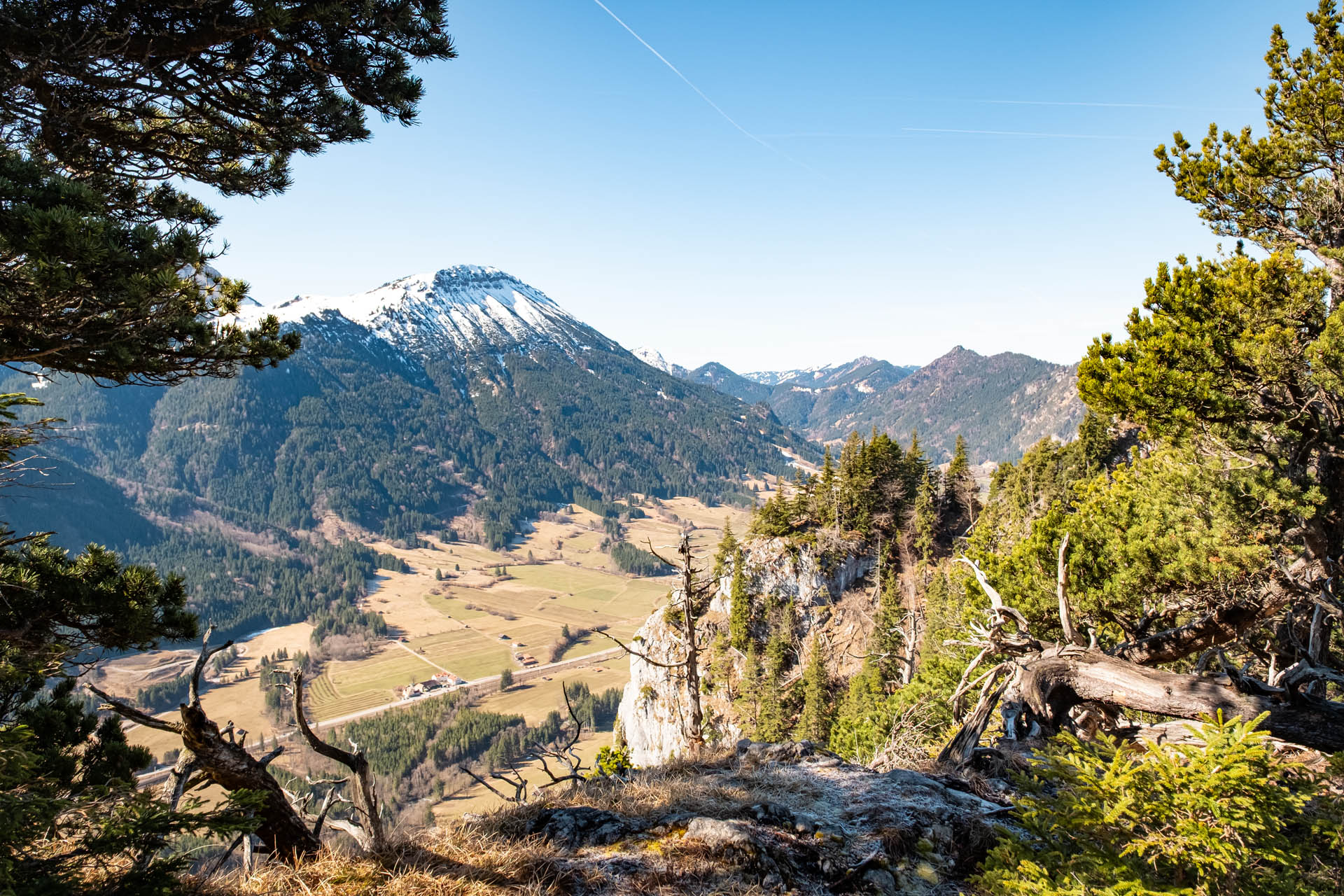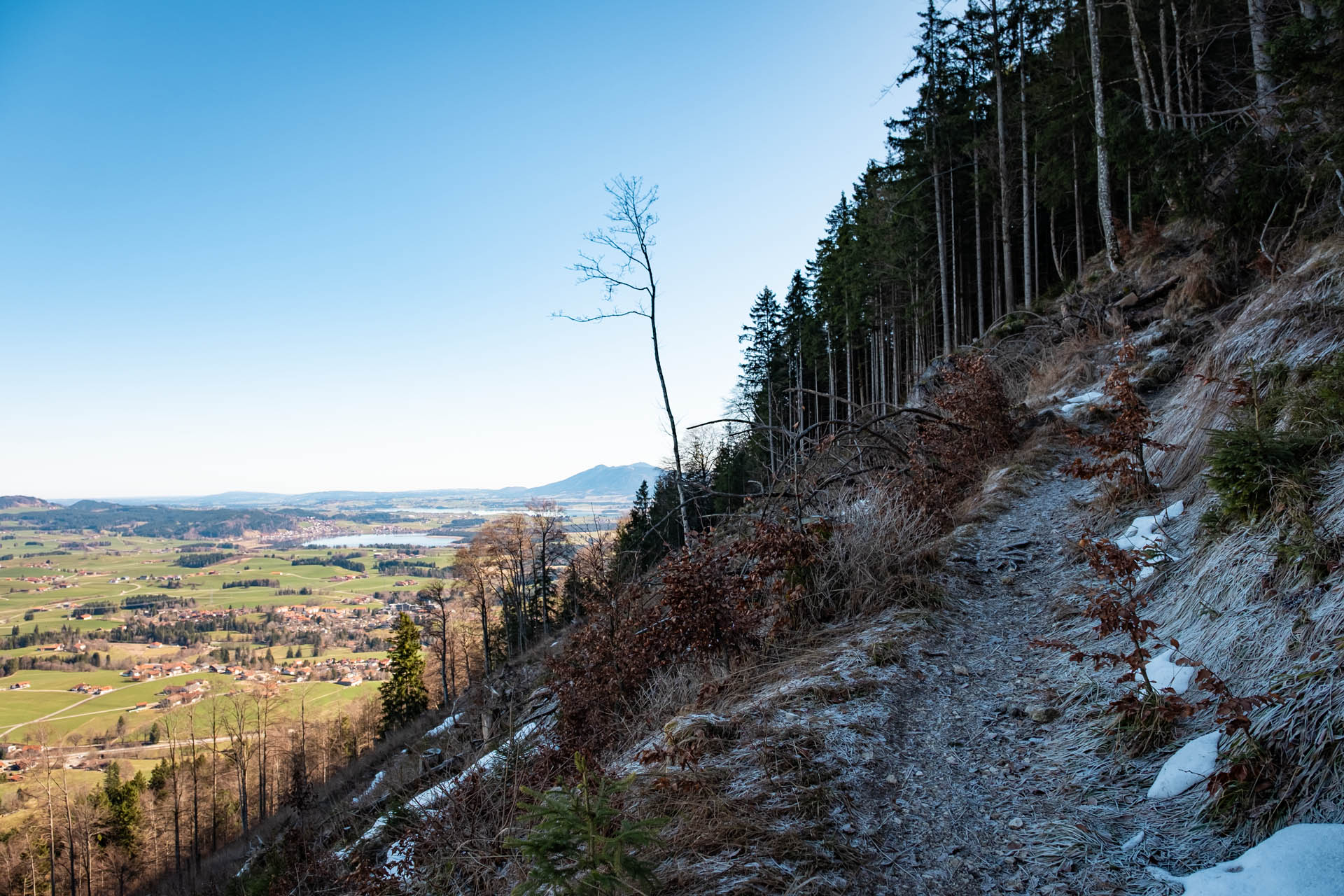 Der Weg wird schnell schmaler und steiler, bietet aber zugleich einen tollen Ausblick auf den Hopfensee und den Forggensee. Wir entscheiden uns für den Einstieg dem Normalweg unterhalb des Einerkopfs zu folgen und ab dem Aussichtspunkt ins Vilstal dem Gratweg über den Zwölferkopf zu folgen. Achtung: Der direkte Gratweg über den Zwölferkopf ist teils ausgesetzt, besonders bei Nässe solltest du hier vorsichtig sein (T3+). Eine Stelle ist dabei mit Drahtseil versichert. Gut zu wissen: Der Gratweg kann auch über den Normalweg auf der Nordseite umgangen werden.