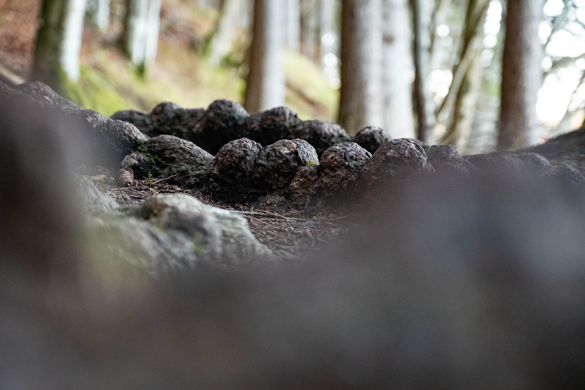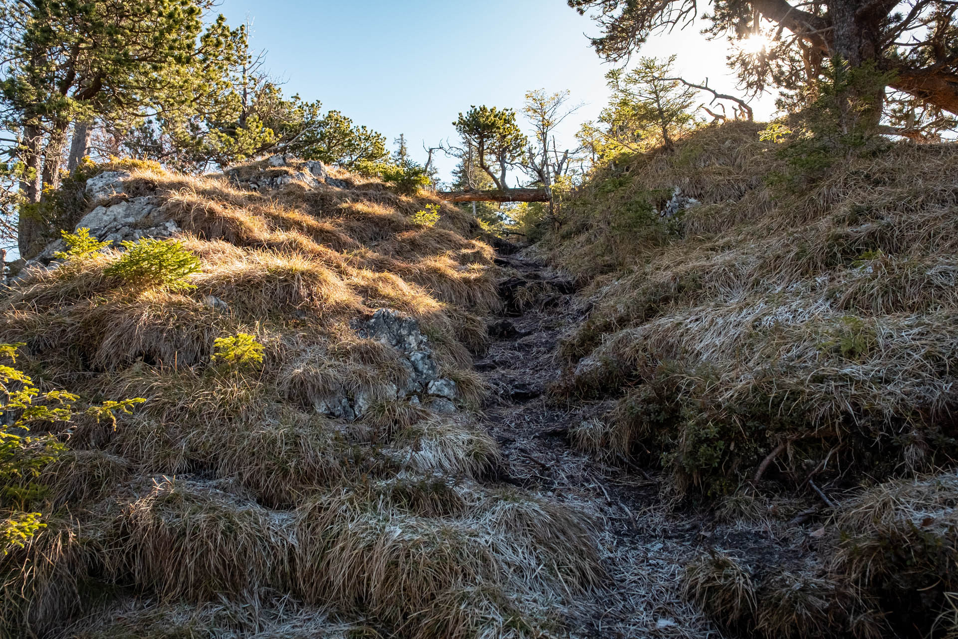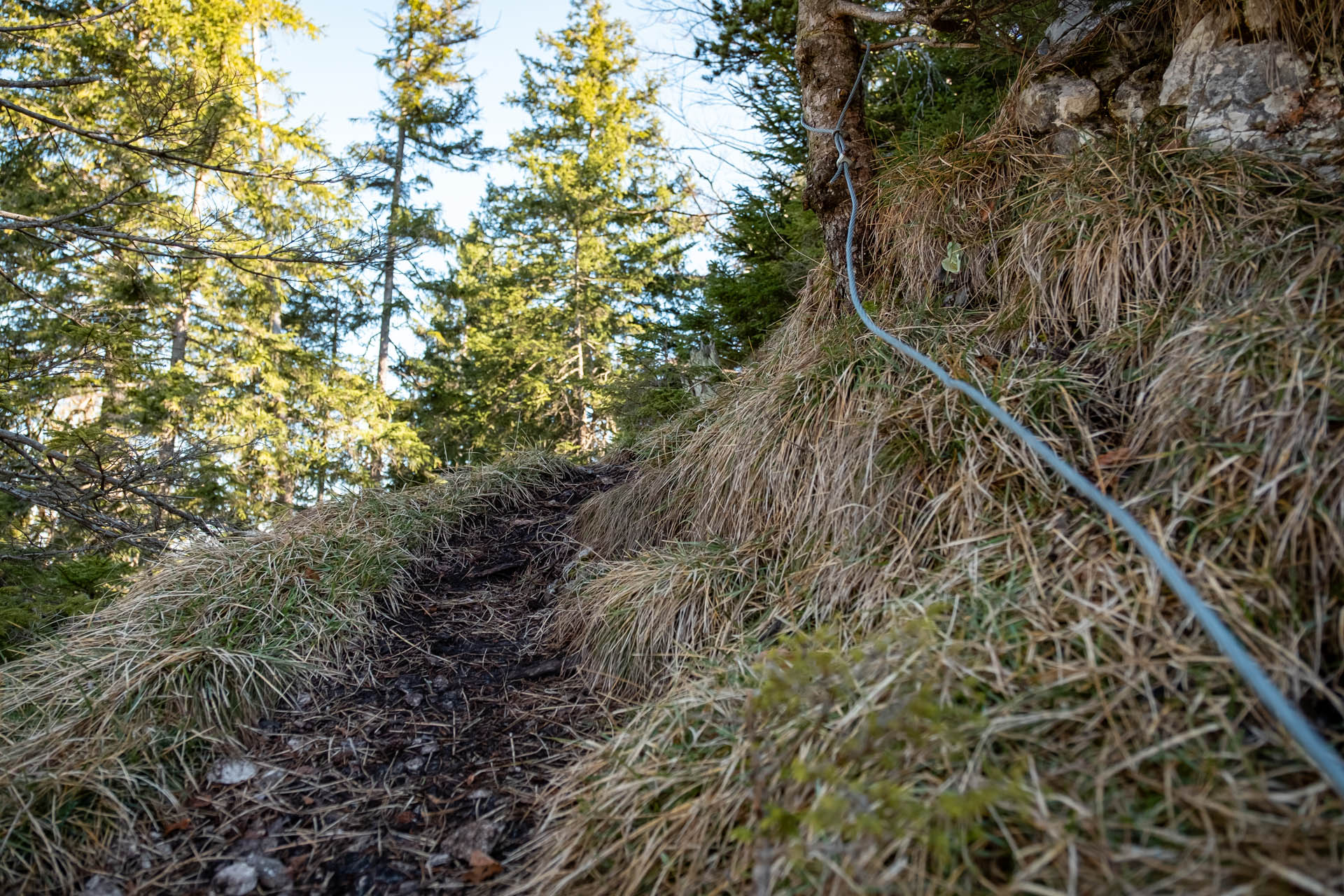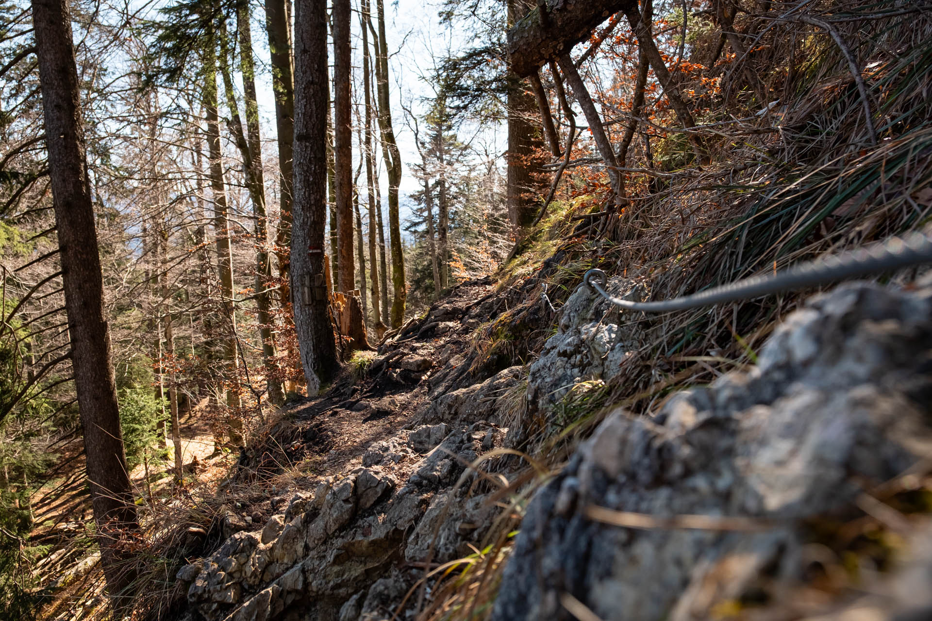 Der Weg führt nun durch den Wald bergab, teils über Wurzeln, teils felsdurchsetzt. An einer etwas sandigen Wegstelle kanns kurz etwas rutschig werden (nicht ausgesetzt), Wurzeln bieten Halt.
