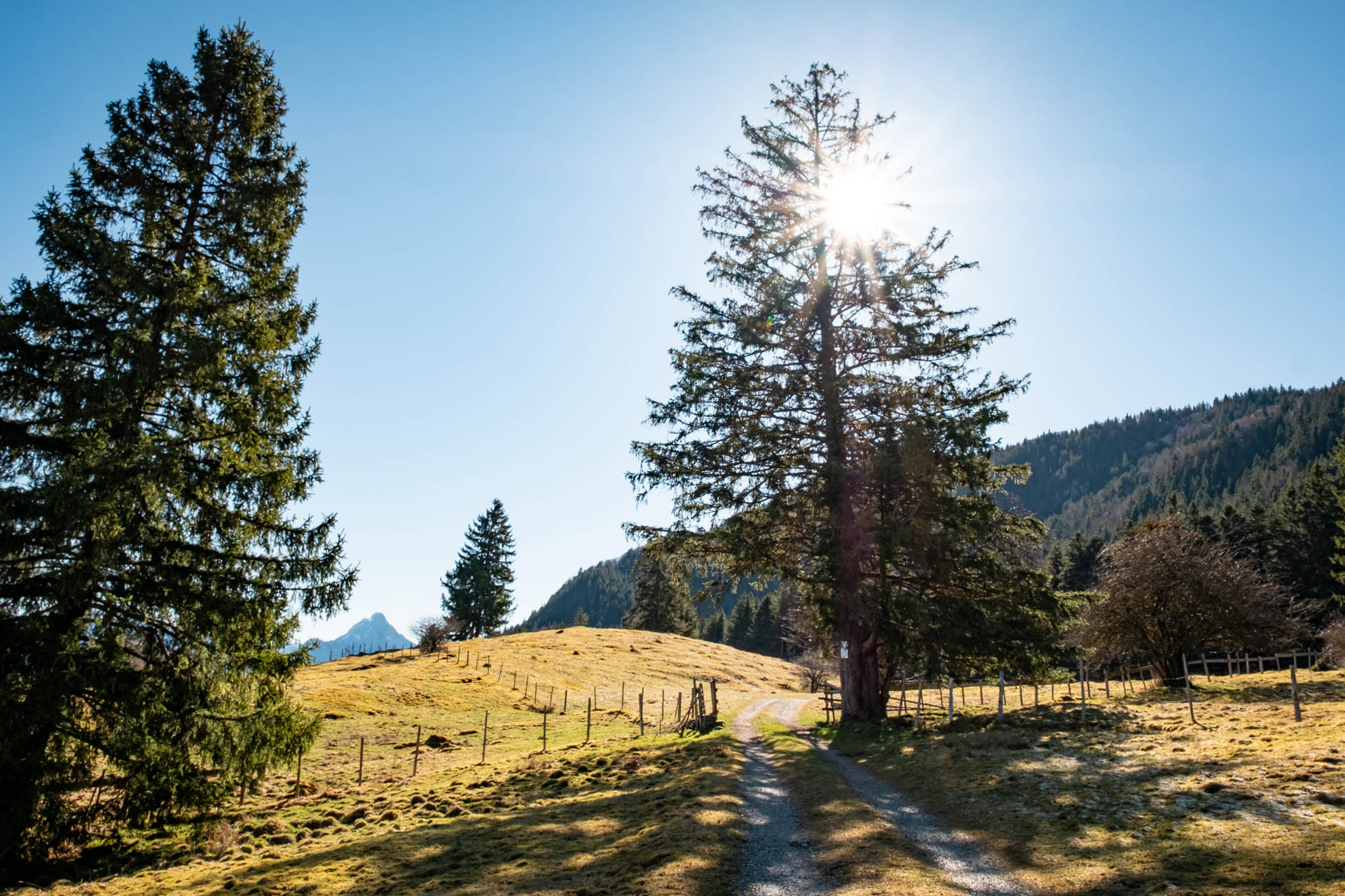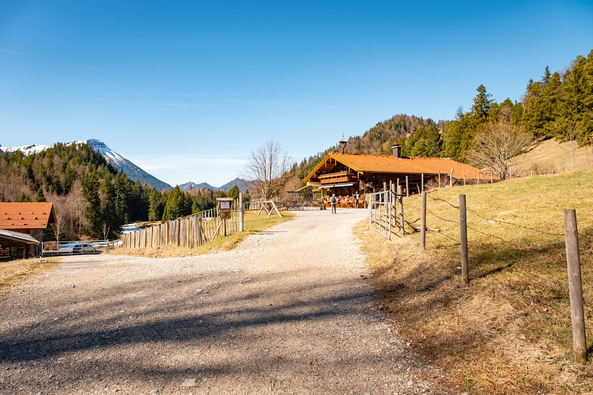Für den Start unserer Wanderung wählen wir den kostenpflichtigen Parkplatz am nordwestlichen Ufer des Weißensees. Von dort folgen wir zuerst dem Uferweg in südlicher Richtung am wunderschön gelegenen Weißensee mit tollem Blick auf die Ostallgäuer Berge. Bereits nach einigen Metern zweigt der Uferweg auf einen asphaltierten Weg ab und wir folgen nun dem Weg entlang der Hauptstraße nach Roßmoos. Der etwas erhöhte Blick zurück über den Weißensee ist absolut lohnenswert. In Roßmoos angekommen wandern wir durchs Dorf, stets dem Wegweiser Richtung Burgruine Falkenstein folgend.