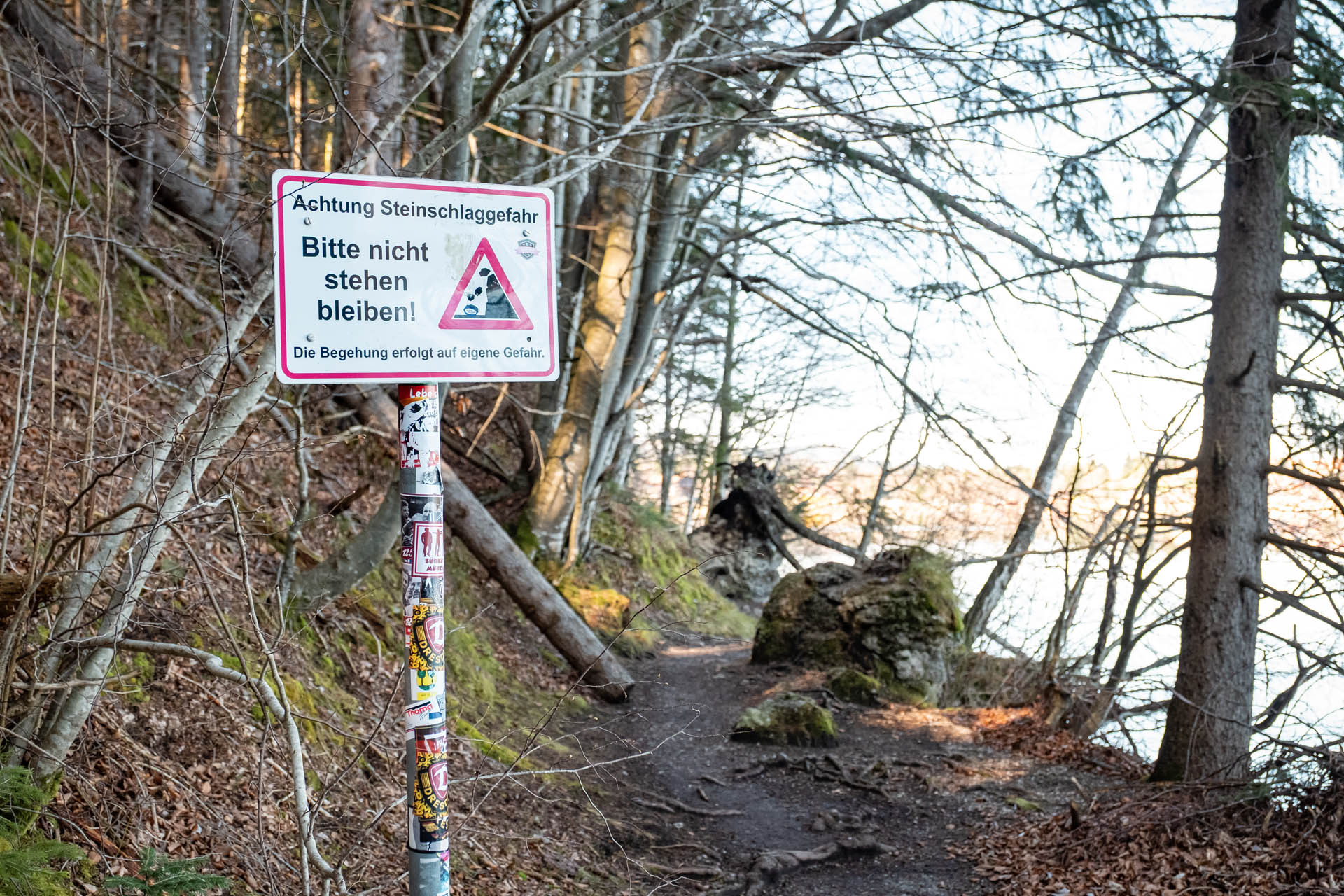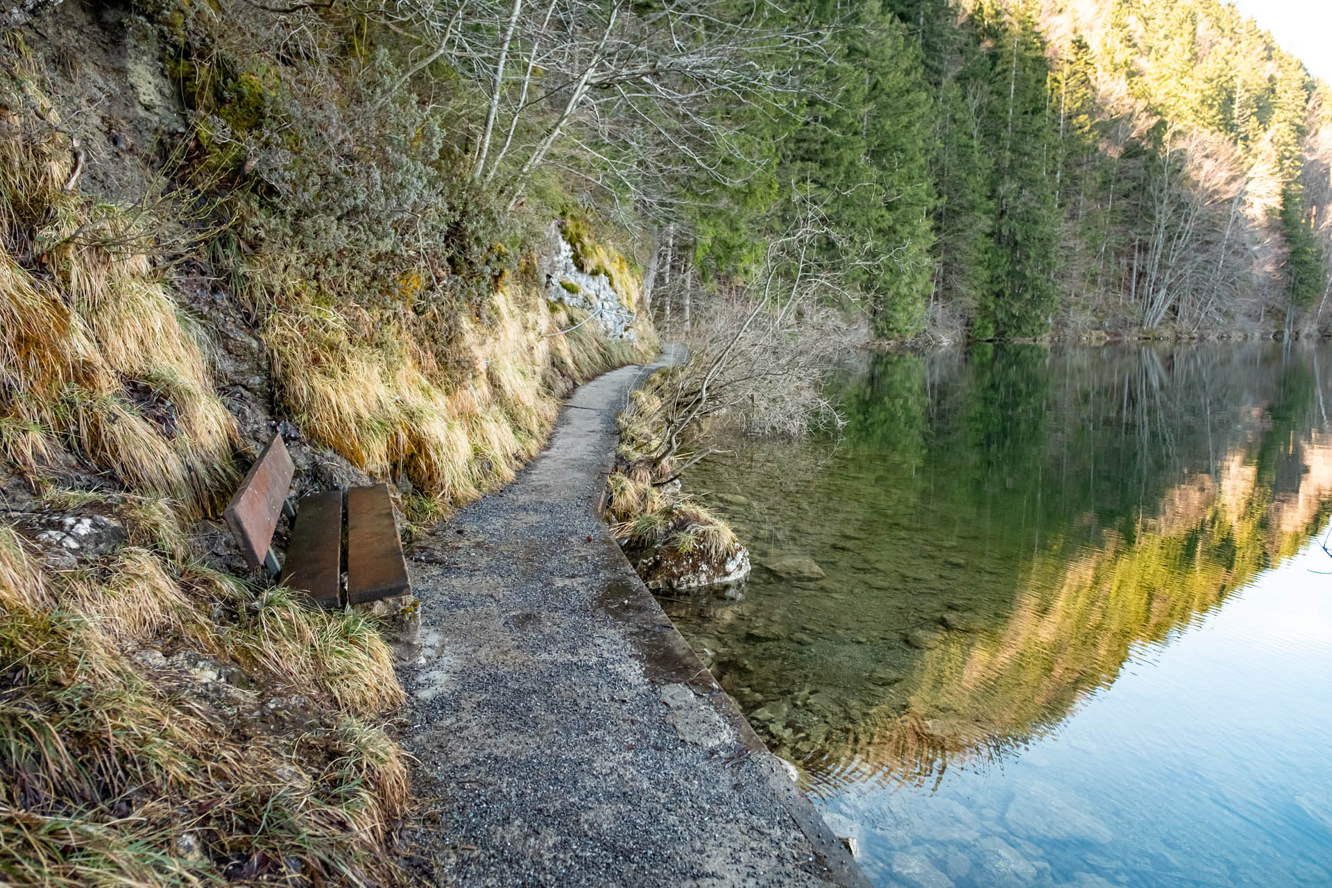 Nach einer ausgiebigen Rast mit Bergblick folgen wir dem breiten, teils steilen Schotterweg durch den Wald hinunter zum Alatsee. Am Ufer angekommen erreichen wir nach wenigen Metern den dortigen Parkplatz. Von dort folgen wir der asphaltierten Saloberstraße in nördlicher Richtung hinunter Richtung Weißensee (Ostufer). Wir wandern auf dieser ein gutes Stück bergab, bevor der Weg dann wegweiserlos auf einen breiten Forstweg nach links abzweigt (mit Schranke), der uns direkt ans Ufer des Weißensees bringt. Hier zweigen wir nach links ab und wandern wunderschön gelegen, meist auf einem schmalen Weg (Wurzeln, Schotter, Beton) direkt am Ufer entlang zurück zum Ausgangspunkt unserer Rundwanderung. Achtung noch an einer Stelle: Bereits ein Stück vorher kündigt ein Schild Steinschlaggefahr an. In diesem Bereich solltest du nicht stehen bleiben, sondern zügig weiterwandern.